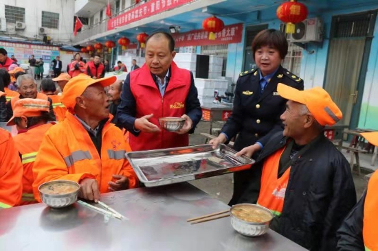 當(dāng)日凌晨5時許,太康縣愛心早餐點人頭攢動,熱鬧非凡,一輛裝滿新鮮蔬菜的大貨車停放在院中,20多名城管志愿者在太康縣城管局局長張愛梅的帶領(lǐng)下正從車上往下卸蔬菜。聽說愛心企業(yè)要為環(huán)衛(wèi)工捐贈蔬菜,太康縣委常委、統(tǒng)戰(zhàn)部長張新棟也放棄節(jié)日休息,天不明趕到太康愛心早餐點,加入到蔬菜裝卸行列?!肮?jié)日里,縣領(lǐng)導(dǎo)也不忘過來看望我們環(huán)衛(wèi)工,真讓人感動啊?!笨粗鴱埿聴潯垚勖返热嗣η懊笮妒卟?,臉上浸滿了汗珠,環(huán)衛(wèi)工張大爺?shù)热藙忧榈卣f,“社會上有這么多好人關(guān)心我們環(huán)衛(wèi)工,我們再苦再累也值了!”