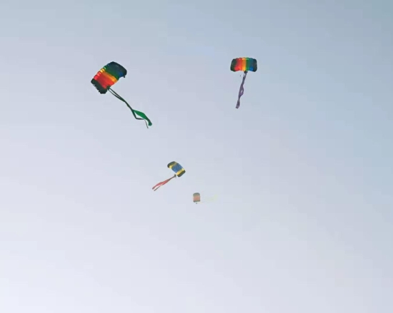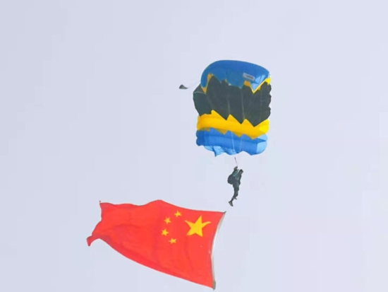 “看,跳傘表演開始了。”10月29日上午,周口西華通用機(jī)場(chǎng)首航儀式結(jié)束后,一場(chǎng)精彩絕倫的飛行表演就開始了。載著跳傘運(yùn)動(dòng)員的飛機(jī)起飛到指定地點(diǎn)后,運(yùn)動(dòng)員攜帶著國旗和彩帶從高空中跳下,打開傘包后,空中五顏六色十分漂亮,引得圍觀群眾不時(shí)叫好。