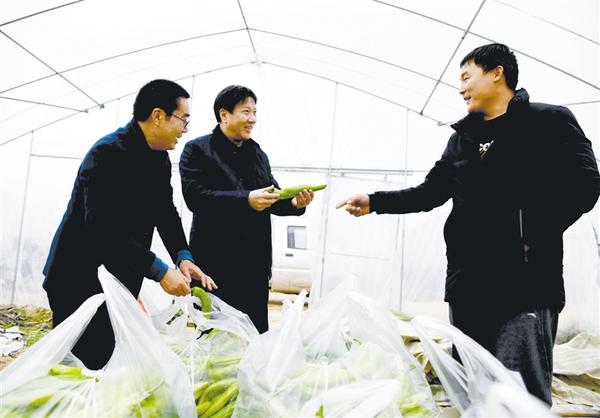 近日,周口報(bào)業(yè)傳媒集團(tuán)幫扶村——淮陽縣馮塘鄉(xiāng)劉莊村的扶貧蔬菜大棚最后一棚辣椒采摘上市。據(jù)了解,這里產(chǎn)的辣椒個(gè)頭大、口感好,很暢銷。圖為周口報(bào)業(yè)傳媒集團(tuán)黨委副書記、總編輯、周口日報(bào)社總編輯顧玉杰(中)向種植戶了解辣椒銷售情況。 記者 梁照曾 攝