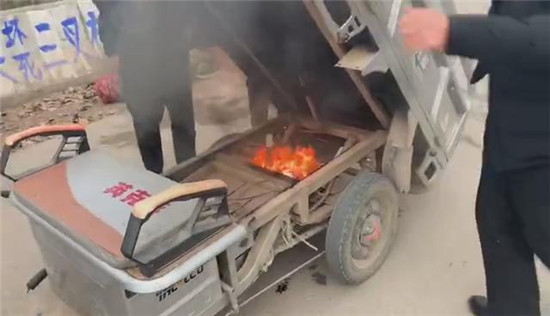 “當(dāng)時(shí)在我們前方的一輛電動(dòng)三輪車駕駛座下冒出黑煙,車上兩位老人察覺(jué)到危險(xiǎn)后,急忙下車,站在一旁不知所措。我們也緊跟上前。事發(fā)突然,現(xiàn)場(chǎng)沒(méi)有滅火器和可利用水源,而三輪車的火越來(lái)越大,兩位老人著急萬(wàn)分,在旁邊不停地請(qǐng)求我們幫幫她們。根據(jù)經(jīng)驗(yàn),我們當(dāng)機(jī)立斷利用路邊的泥土進(jìn)行撲救,經(jīng)過(guò)幾十秒的緊張撲救,著火部位被成功撲滅。”三位消防隊(duì)員回憶說(shuō)三輪車是電線短路引起的電瓶著火。