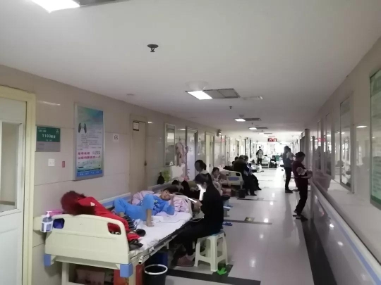 在周口市中心醫(yī)院門診部輸液處,數(shù)排輸液座椅坐滿了輸液的患者,患者中絕大部分是孩子。在周口市中心醫(yī)院住院部11樓兒科A、B兩個(gè)病區(qū),每個(gè)病房?jī)?nèi)全部住滿患者,病區(qū)走廊已經(jīng)布滿加床,一些病人只能臨時(shí)住在加床上??梢钥吹郊哟驳木幪?hào),已經(jīng)排到了50號(hào)之后。