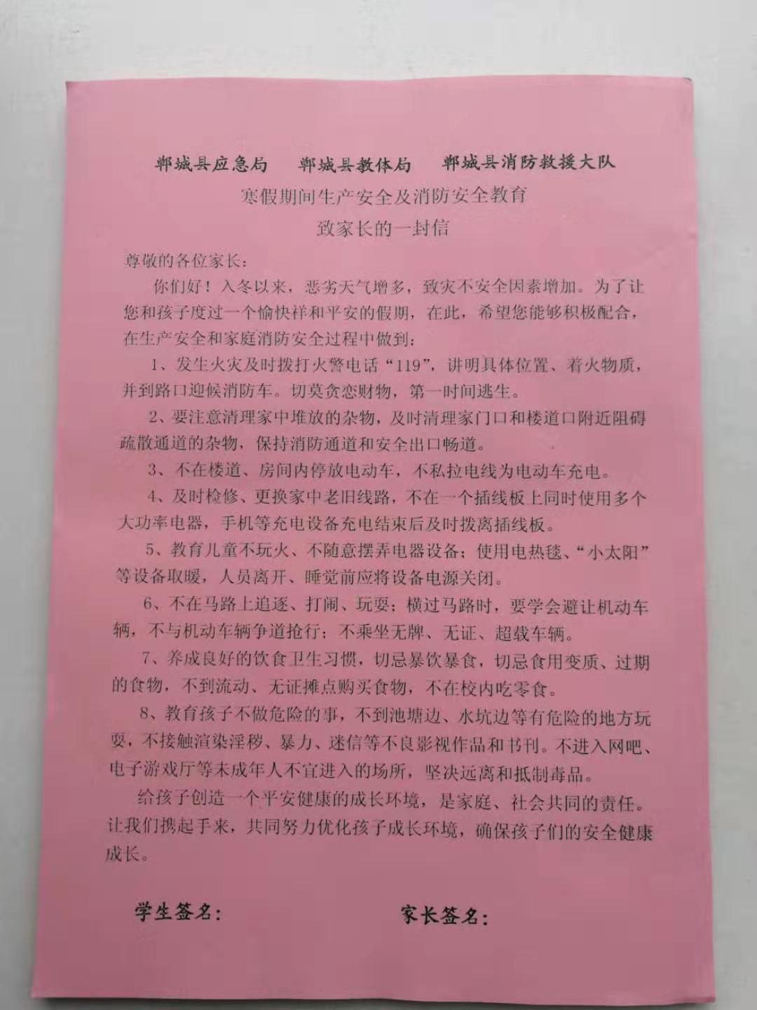 1月13日,寒假即將到來。鄲城縣為進(jìn)一步加強(qiáng)春節(jié)期間的安全生產(chǎn)和消防安全工作,鄲城縣印制30萬份《寒假期間生產(chǎn)安全和消防安全教育致家長的一封信》,發(fā)放到全縣近30萬名中小學(xué)生手中,希望通過“小手拉大手”的形式,廣泛傳播生產(chǎn)安全和消防安全知識(shí),確保全縣廣大人民群眾度過一個(gè)安全祥和的春節(jié)。