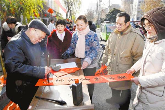 1月19日,由周口市民間文藝家協(xié)會(huì)、川匯區(qū)文聯(lián)聯(lián)合舉辦的“送萬福進(jìn)萬家”義寫春聯(lián)活動(dòng),在周口華威民俗文化博物苑門前舉行。來自市書協(xié)、川匯區(qū)書協(xié)的20多名書法家現(xiàn)場揮毫潑墨,義寫春聯(lián)和“?!弊郑艿绞忻竦囊恢潞迷u。記者 梁照曾 攝