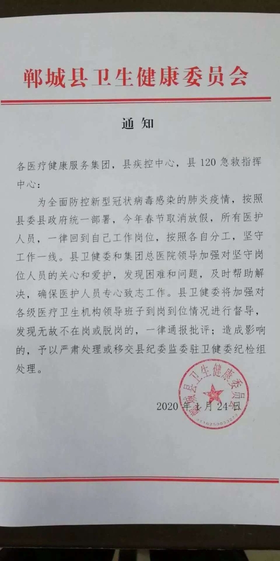 在全國疫情防控形勢較為嚴(yán)重情況下,衛(wèi)健委充分認(rèn)識(shí)到加強(qiáng)新型肺炎疫情防治工作的重要性和急迫性,于1月24下發(fā)取消全縣醫(yī)護(hù)人員春節(jié)假期的通知。要求所有醫(yī)護(hù)人員,一律回到自己工作崗位,按照各自分工,堅(jiān)守工作一線。