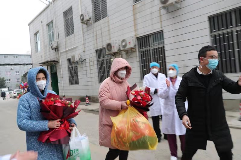 當(dāng)日下午3時(shí),朱某某、陳某某在醫(yī)護(hù)人員的陪伴下從病房里走出,太康縣人民醫(yī)院院長(zhǎng)聶方華帶領(lǐng)院領(lǐng)導(dǎo)班子與醫(yī)護(hù)人員一道給兩名出院的患者舉行了簡(jiǎn)單而熱烈的祝賀儀式?!案兄x偉大的祖國(guó),感謝偉大的黨,感謝太康縣委、縣政府,感謝醫(yī)院的醫(yī)護(hù)人員!”患者陳某某出院時(shí),“感謝”二字一直掛在嘴邊。為了表達(dá)謝意,朱某某、陳某某出院前專(zhuān)門(mén)委托家人給醫(yī)護(hù)人員送來(lái)了鮮花。