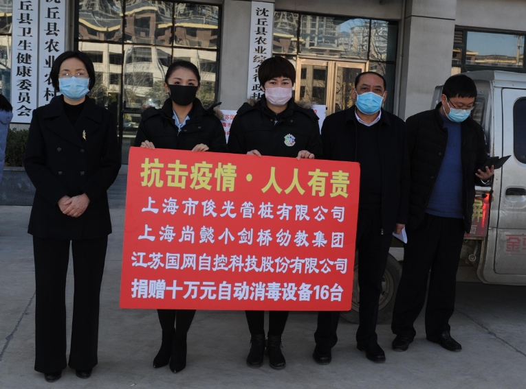 2月18日,在沈丘縣疫情防控指揮部,上海市俊光管樁有限公司、江蘇國網(wǎng)自控科技股份公司、上海上懿小劍橋教育管理有限公司聯(lián)合捐贈(zèng)價(jià)值10萬元的自動(dòng)消毒設(shè)備16套,沈丘縣洲業(yè)車業(yè)有限公司(洲業(yè)國際汽車城)捐贈(zèng)84消毒液(10升/桶)17桶、(5升/桶)166桶,沈丘縣華順農(nóng)業(yè)建設(shè)工程有限公司捐贈(zèng)75%酒精消毒液(非醫(yī)用)(2.5L/桶x6/件)168件、一次性使用醫(yī)用橡膠檢查手套(100副/盒)53盒,用于疫情防控工作??h委常委、縣政府黨組成員馬偉,縣政協(xié)副主席、縣工商聯(lián)主席張瑛,縣政府辦副主任韓向立出席捐贈(zèng)儀式。