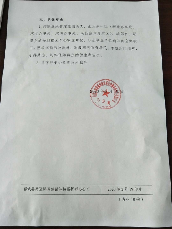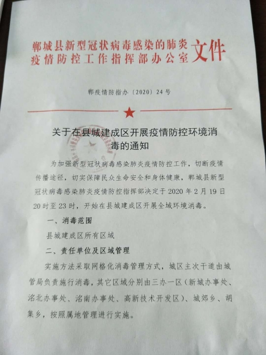 2月19日,記者從鄲城縣新冠肺炎疫情防控指揮部了解到,《鄲疫情防指辦〔2020〕24號(hào)》指出,為加強(qiáng)新型冠狀病毒感染肺炎疫情防控工作,切斷疫情傳播途徑,切實(shí)保障民眾生命安全和身體健康,鄲城縣新型冠狀病毒感染肺炎疫情防控指揮部決定于2020年2月19日20時(shí)至23時(shí),開始在縣城建成區(qū)開展全域環(huán)境消毒。