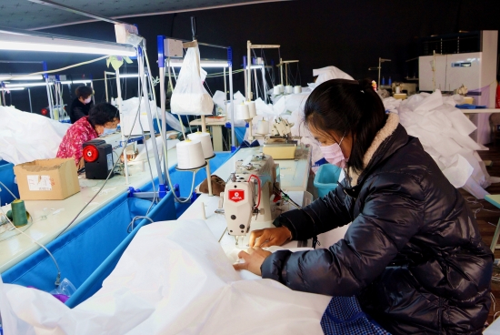 2月25日,項城市南頓鎮(zhèn)水牛劉行政村扶貧車間內,幾名工人正忙著加工醫(yī)用防護服。疫情期間,為保障需求,該車間已經加班加點完成了2000套醫(yī)用防護服的訂單任務。