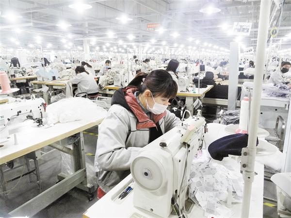2月26日,商水縣阿爾本制衣有限公司的員工正在生產(chǎn)車間加工服裝。商水縣在嚴(yán)格做好疫情防控的同時(shí),又做好企業(yè)復(fù)工復(fù)產(chǎn)工作。目前,該縣10家大型企業(yè)和6個(gè)扶貧車間有返崗人員3萬(wàn)多人。喬連軍攝