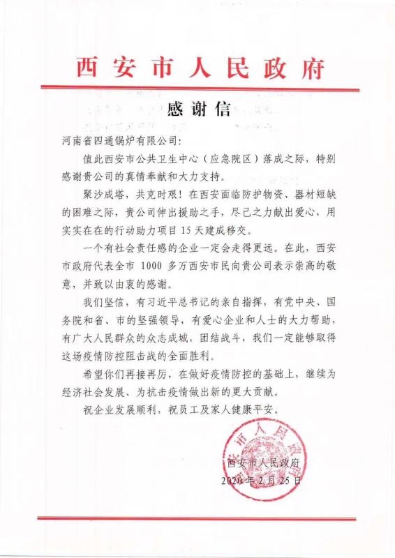 “聚沙成塔,共克時(shí)艱!在西安面臨防護(hù)物資、器材短缺的困難之際,貴公司伸出援助之手,盡己之力獻(xiàn)出愛心,在此西安市政府代表全市1000多萬西安市民向貴公司表示由衷的感謝”。這是西安市政府對(duì)太康縣拔尖人才、河南省四通鍋爐有限公司總經(jīng)理馮坤的感謝信。一方有難,八方支援。在新聞上了解到武漢新冠肺炎疫情突發(fā)的情況后,他連夜與中國紅十字會(huì)和武漢紅十字會(huì)取得聯(lián)系,詢問向新建的火神山醫(yī)院捐贈(zèng)醫(yī)用鍋爐和捐款事宜,通過網(wǎng)上銀行將30萬善款轉(zhuǎn)入武漢紅十字會(huì)賬戶中。