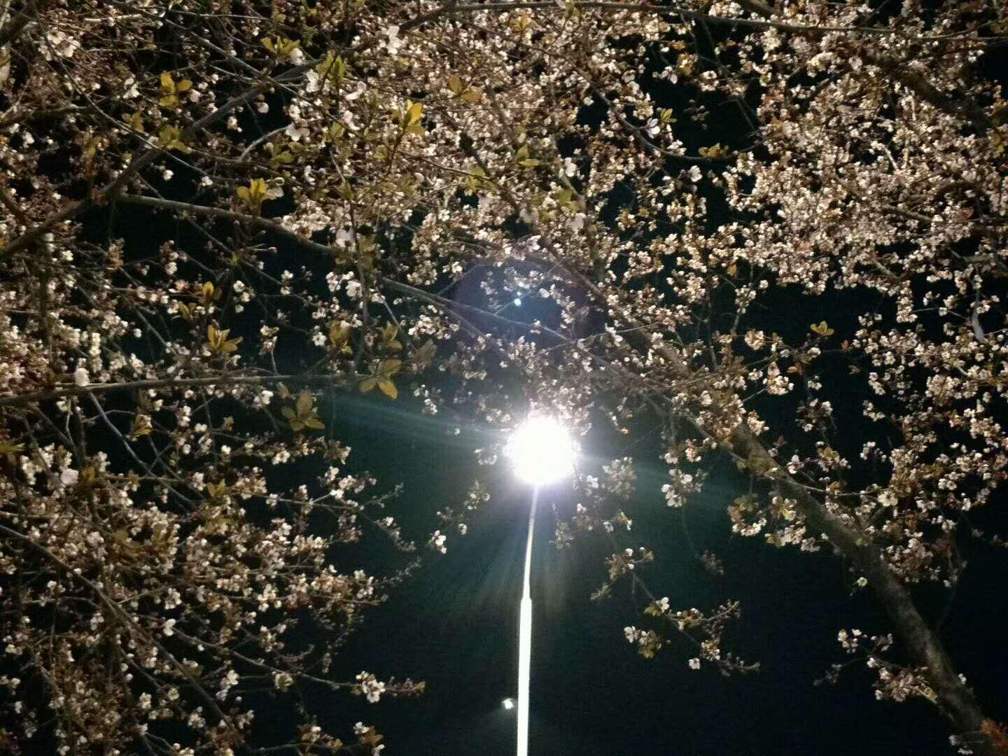 路燈照耀下的紫葉李,花兒開得繁密而明亮。