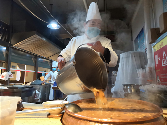 當(dāng)日凌晨3時(shí)30分,記者趕到這家早餐店,這里已是燈火通明,廚師和員工經(jīng)過測(cè)溫消毒后開始了一天繁忙的工作?!半m然現(xiàn)在允許堂食了,但我們的防控工作依然沒有放松,認(rèn)真做好每一位食客的測(cè)溫和登記工作。”該店經(jīng)理王艷告訴記者,他們是昨天接到縣食品藥品監(jiān)督部門允許堂食的通知,隨后,他們對(duì)店面進(jìn)行了全面消殺工作,并將餐桌撤掉一半,保持一米以上間隔距離。