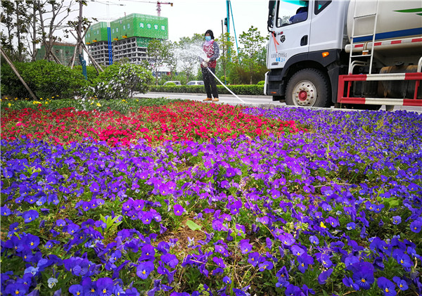 4月20日,在文昌大道道路綠化帶上,市政工人正在為栽種的花卉綠植補(bǔ)充水分。入春以來(lái),我市城區(qū)一直在進(jìn)行美化綠化,現(xiàn)在各個(gè)街道逐漸顯現(xiàn)出絢麗身姿。市民走在市區(qū)的每個(gè)街道都能看到各色花卉、綠植,很是養(yǎng)眼。