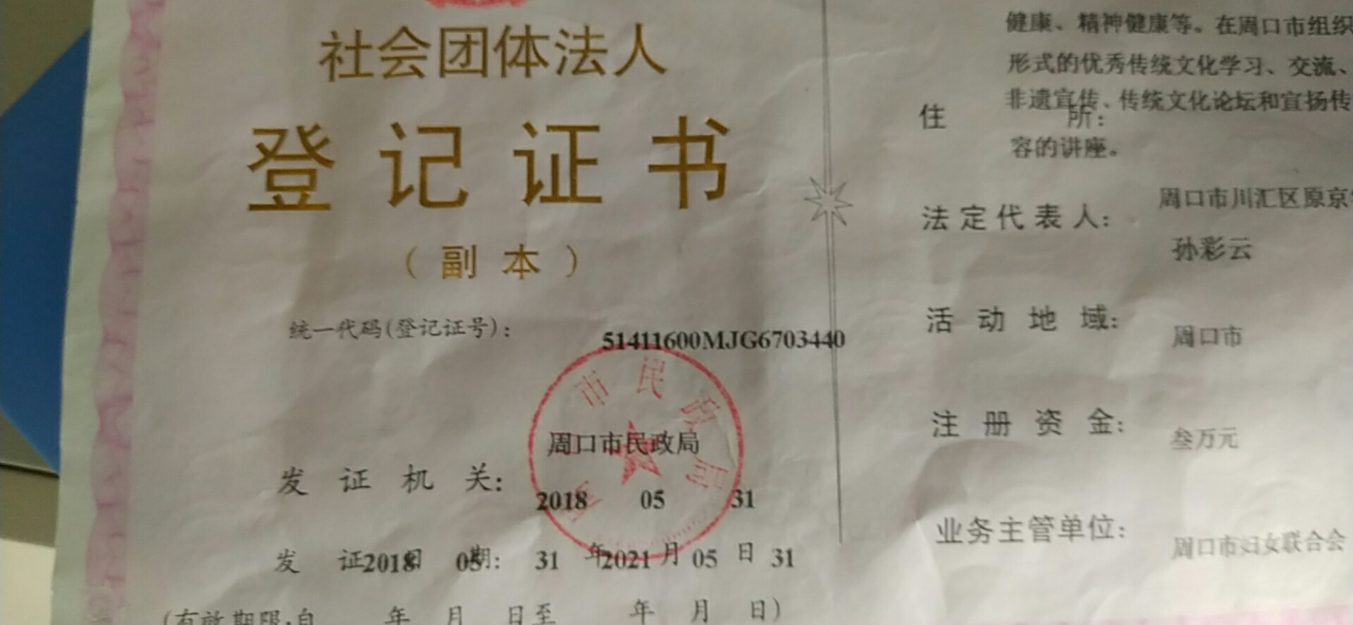 當孫彩云把成立志愿者團體的想法在微信群里公布后,得到了群友們的積極響應??擅耖g志愿團體只有熱情是不夠的,憑著不達目的誓不罷休的性格,孫彩云一家家尋找掛靠單位,功夫不負有心人,她的毅力感動了周口市婦聯(lián)。在市婦聯(lián)的支持下,2017年4月28日,組織定名“周口市慈孝文化促進會”,同年5月8日,首次護河行動在大鐵牛下舉行,成為守護母親河的起點。2018年5月31日,周口市民政局批示下發(fā)“社會團體法人登記證書”,慈孝文化促進會正式成為國家注冊社會組織。