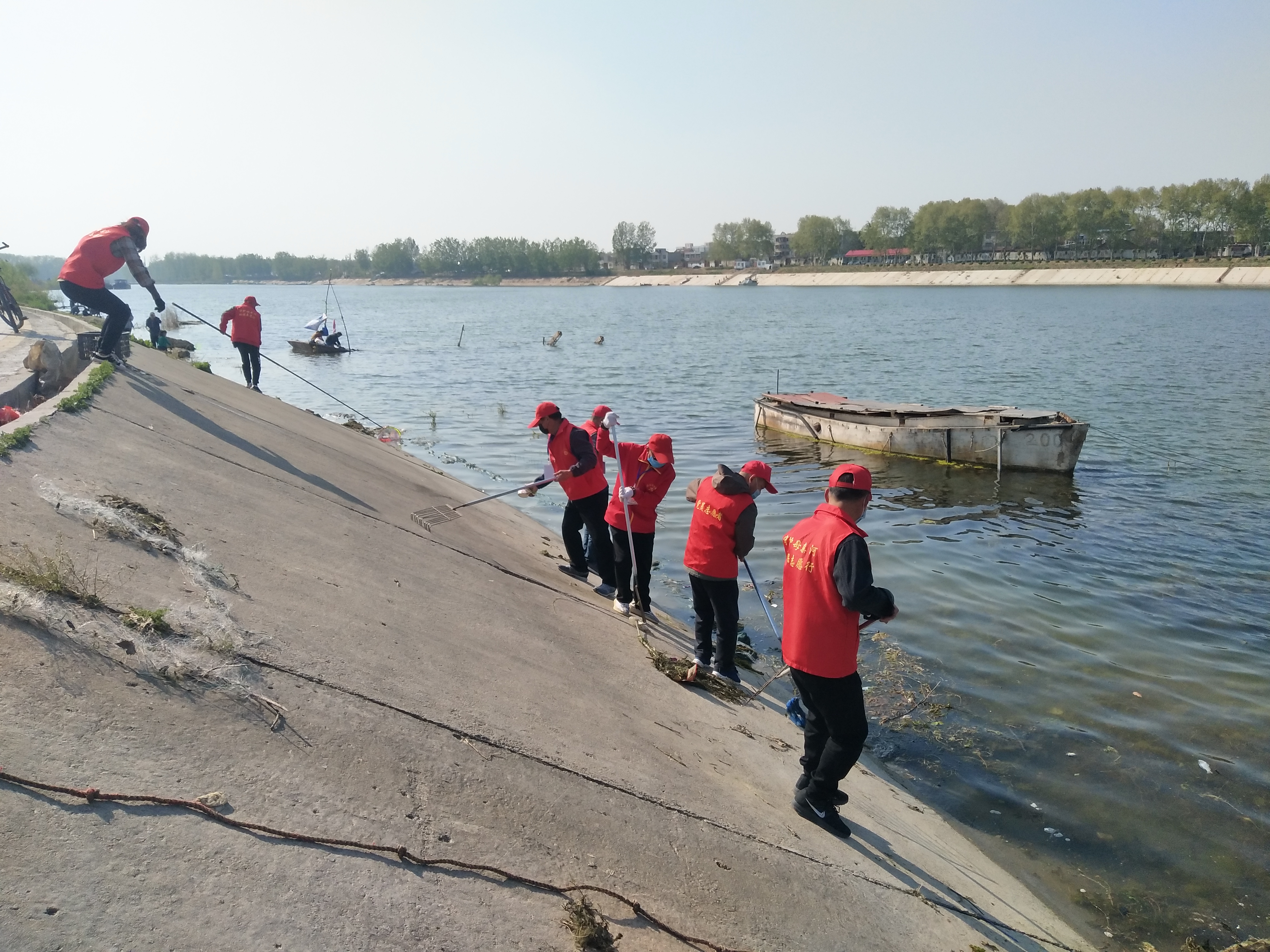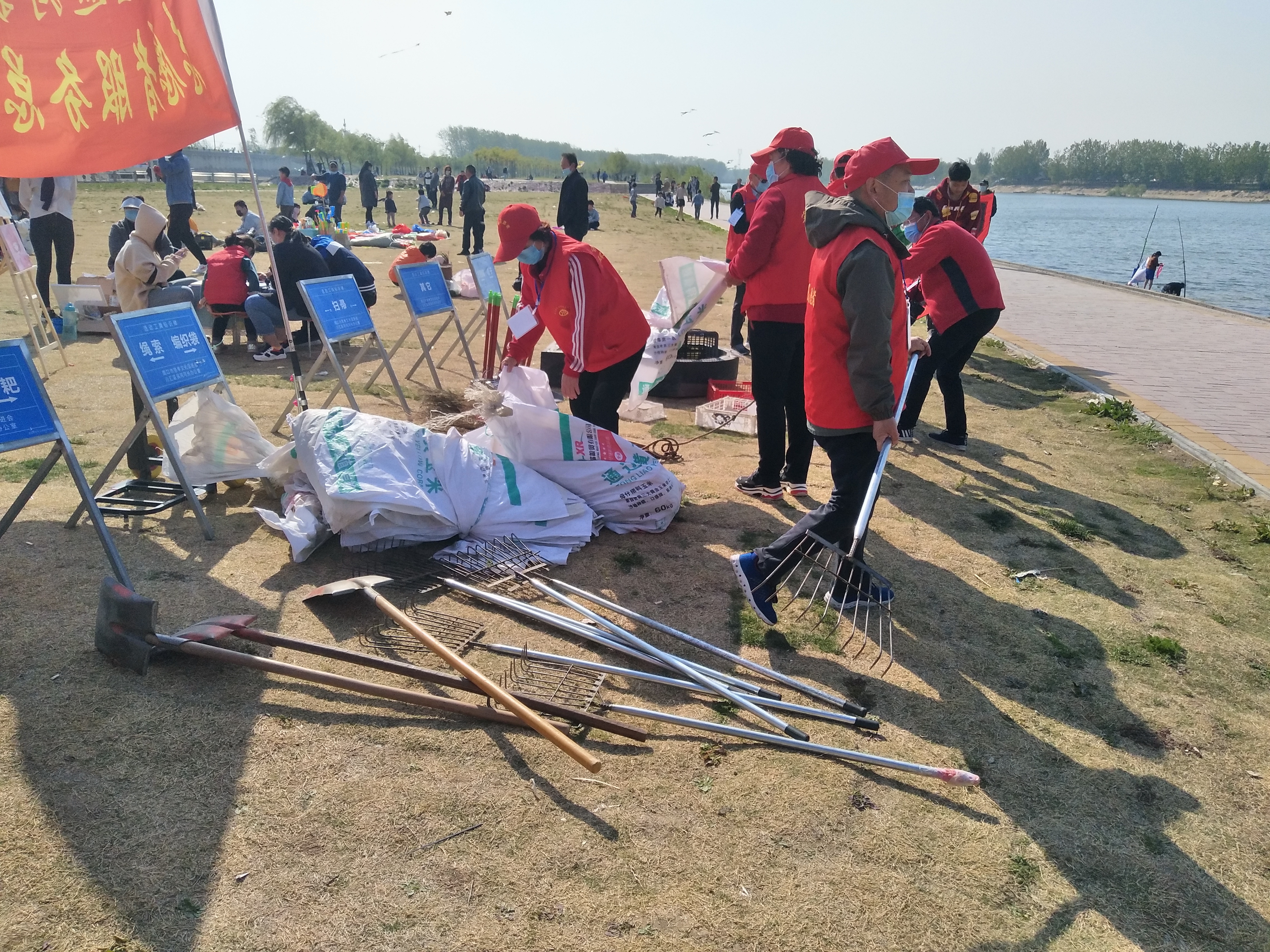 問卷棚旁是擺放整齊的河面垃圾清理工具,鐵锨、鐵耙、繩索、編織袋、掃帚、垃圾箱一字排開,寫有“川匯區(qū)巡河護河”、“志愿者服務總隊”字樣的紅旗迎風飛揚。記者向志愿者借了身衣服,和大家一起等著護河總指揮孫彩云分工。