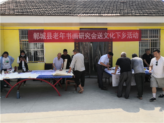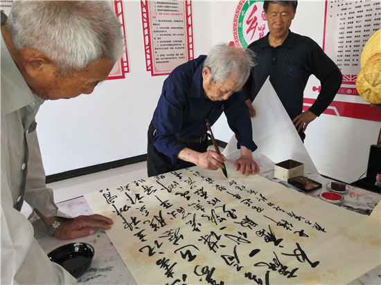 曾慶祥、李宏亮、閆子明、朱好明、單建勛、劉祖祥等9名老年書畫名家一下車,顧不上休息,就紛紛潑墨揮毫,現(xiàn)場為群眾義寫義畫486幅,為村民們獻上一場難得一遇的文化盛宴。雖然天氣炎熱,但是書畫家不辭辛苦,就連已經(jīng)89歲的李宏亮老師中間也不曾休息片刻,直到中午12:30才收筆,熱火朝天的工作激情贏得了干部群眾的一致好評,也都豎起大拇指為他們點贊!