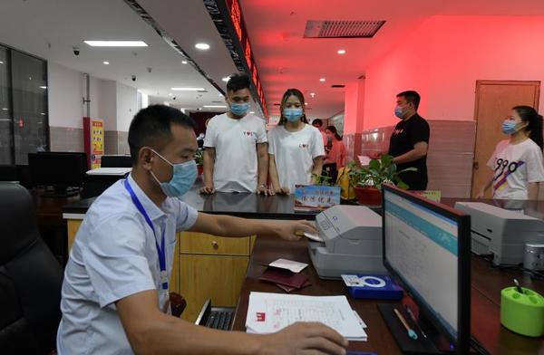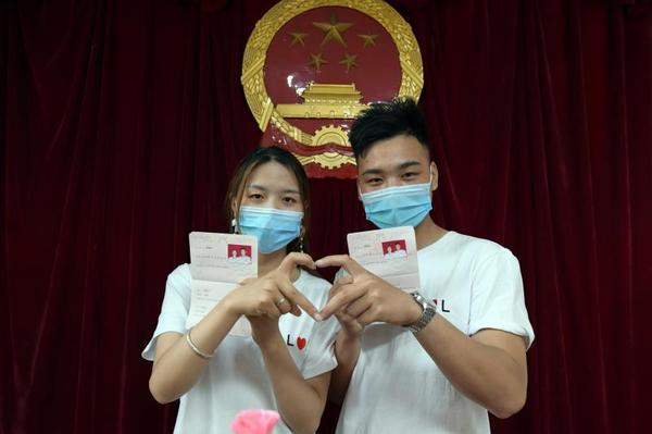 “你就是因?yàn)橐咔榉揽赝七t婚禮的那個(gè)警察吧!”5月20日上午,在鹿邑縣民政局婚姻登記大廳,工作人員看了身份證件后立即認(rèn)出了他們,專門為他們開通了“綠色通道”;同事們一起在執(zhí)勤的崗?fù)げ贾昧讼矚庋笱蟮摹霸苹槎Y”場地,與他們一起分享幸福的喜悅。