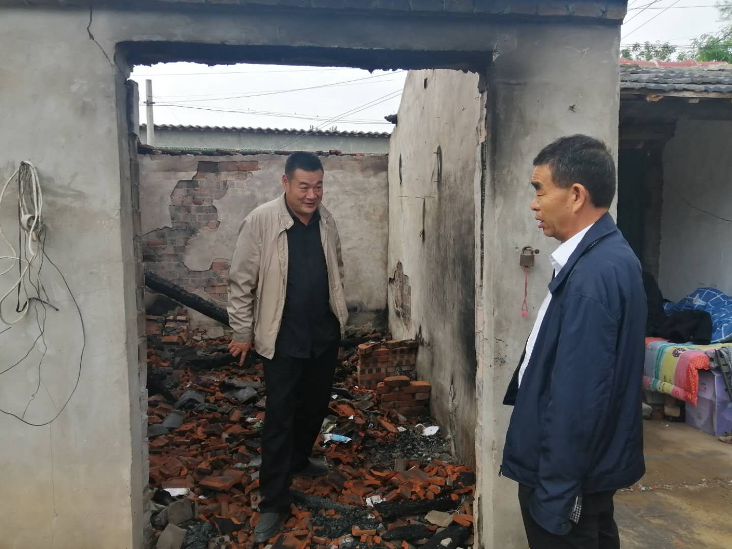 聽完情況后,督導組立刻和駐村工作人員一起到李洪范家查看情況,現場主屋已經全部燒毀,屋里到處是瓦礫......李洪范站在被燒毀的房屋里,表情木納的自言自語道“燒得一干二凈,什么都沒了,這以后咋弄呀?!爆F場詢問其生活情況時,李洪范說,“當天,鄉(xiāng)里邊就送來了米、油和錢。村長也送來了幾件衣服,現在就是沒有地方住?!?/p>