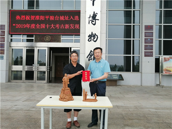 6月12日,在2020年“文化和自然遺產(chǎn)日”即將來臨之際,淮陽區(qū)市級(jí)非物質(zhì)文化傳承人靳偉向市博物館捐贈(zèng)“抗疫”泥塑作品《逆行之守護(hù)者》《隔空擁抱》,以表達(dá)藝術(shù)家對新冠肺炎疫情期間全國醫(yī)務(wù)人員無私精神的敬意。周建山館長向靳偉頒發(fā)榮譽(yù)證書。