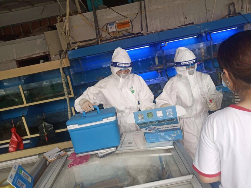 當(dāng)日,分別對(duì)6月14日排查中發(fā)現(xiàn)的一箱三文魚、銷售三文魚的電子秤、分割案板等相關(guān)器具進(jìn)行了核酸檢測(cè),隨后又對(duì)周邊經(jīng)營進(jìn)口凍品的人員及相關(guān)產(chǎn)品也進(jìn)行抽樣檢測(cè)。抽樣完畢后,市場(chǎng)監(jiān)管分局執(zhí)法人員繼續(xù)對(duì)市場(chǎng)內(nèi)的水產(chǎn)品批發(fā)經(jīng)營區(qū)進(jìn)行檢查,查看商戶的相關(guān)資質(zhì)和經(jīng)營環(huán)境,檢查了海鮮類產(chǎn)品的進(jìn)貨渠道及相關(guān)檢疫證明等,共計(jì)檢查海鮮商戶5戶、凍品商戶7戶、水產(chǎn)區(qū)商戶8戶,未發(fā)現(xiàn)由北京新發(fā)地市場(chǎng)進(jìn)口的三文魚類海鮮產(chǎn)品及國外重點(diǎn)疫區(qū)進(jìn)出口水產(chǎn)品。