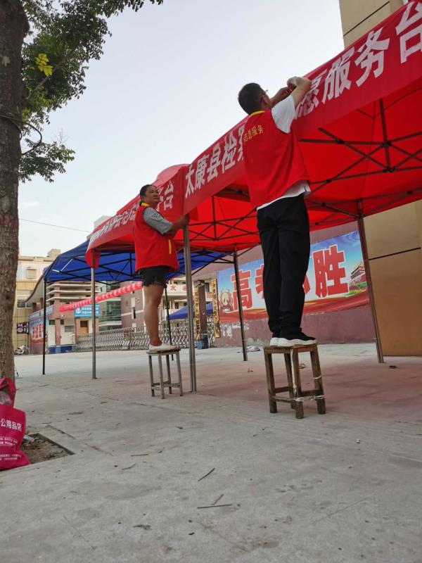 6日下午3時許,鄭雪艷和王作宇二人被安排到太康縣華夏外國語高考考點負責(zé)為考生和家長搭建11個茶水棚?!跋挛?點正是一天中最熱的時候,考點附近也沒有樹蔭?!碧悼h網(wǎng)信辦副主任高一麟回憶說,要在天黑之前搭建好11個茶水棚,對于鄭雪艷和王作宇兩人來說并非易事。