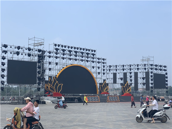 淮陽(yáng)荷花節(jié)開(kāi)幕式舞臺(tái)在太昊陵廣場(chǎng)廣場(chǎng)造型完工。據(jù)悉,2020年7月10日晚8點(diǎn)在此開(kāi)幕,同時(shí)在舞臺(tái)東側(cè)的龍湖上將上演全息水幕燈光秀。