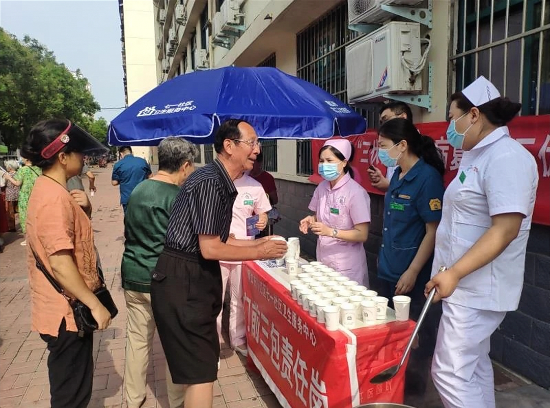 為弘揚(yáng)中醫(yī)藥文化,提高群眾身體素質(zhì),連日來,周口市第二人民醫(yī)院七一社區(qū)衛(wèi)生服務(wù)中心開展冬病夏治三伏湯免費(fèi)飲用活動,吸引了眾多市民參加。圖為醫(yī)護(hù)人員正給市民講解冬病夏治相關(guān)知識,并送上三伏湯。