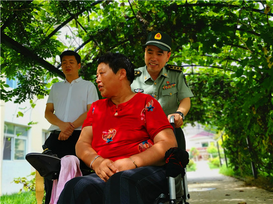 走進位于太昊路上的周口市老年護理院,院內(nèi)整潔有序、花蕊吐香鳥鳴聲聲,小徑通幽處的涼亭內(nèi)三五老人打牌、聊天,一副愜意安詳?shù)纳顖鼍啊T诤顕I(lǐng)母親王玉勤居住的房間內(nèi),李揚、孫光濤等人坐在床邊與她聊天談心,看到這么多人來慰問她,王玉勤眼中流下了感動的眼淚,她對慰問人員表示感謝,說自己來護理院近一年來,吃住條件都不錯,護理院照顧的無微不至,身體一天天恢復(fù),閑暇時還能不依賴輪椅自己走上一段路。她激動地說:“感謝黨和政府的親切關(guān)懷,我最大的愿望是希望倆兒子永遠聽黨的話,在部隊安心服役、再立新功,用優(yōu)異的成績回報黨和政府對我們?nèi)业年P(guān)愛?!?/p>