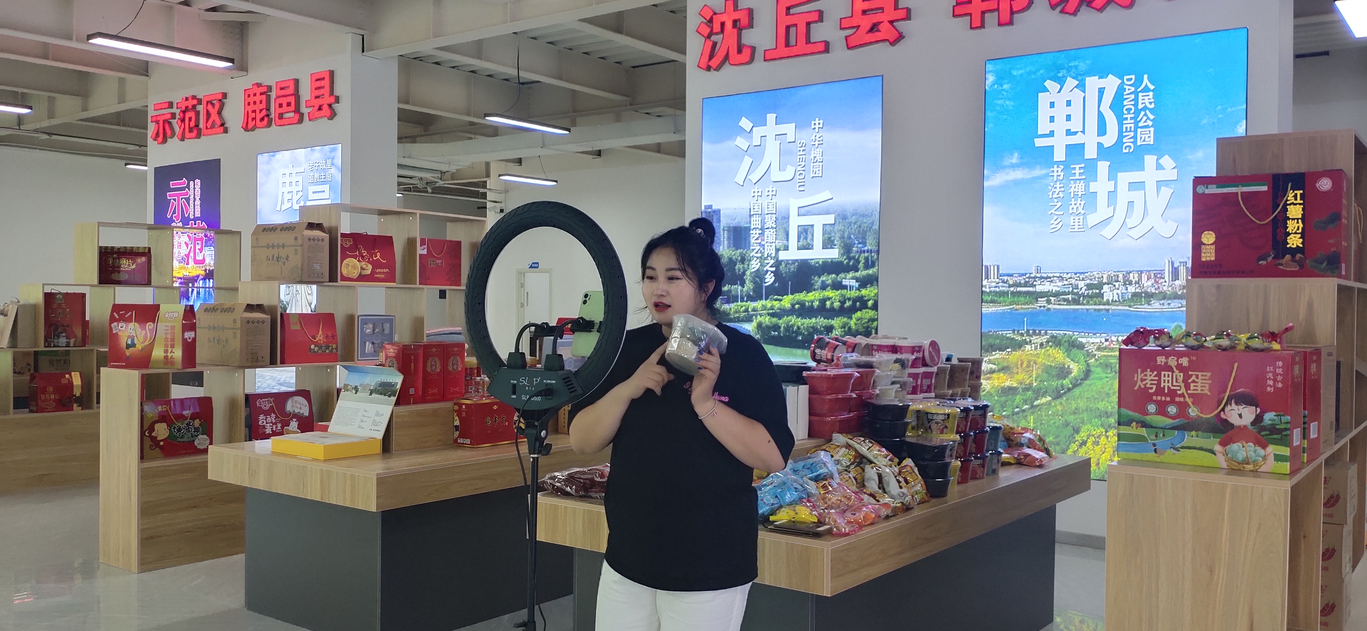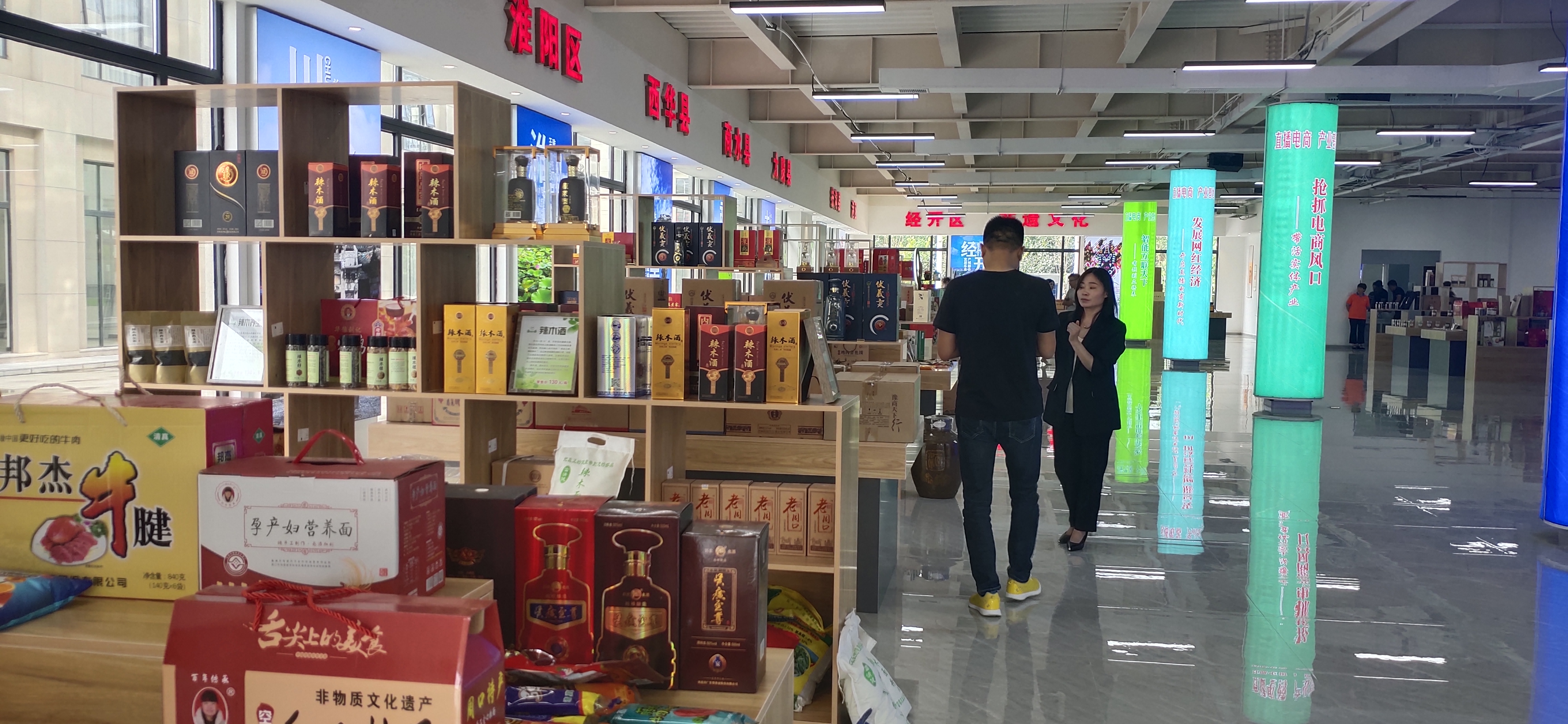 中心展廳面積達(dá)1000多平方米,按照不同縣(市、區(qū))劃分為十幾個(gè)區(qū)域,集中展示邦杰牛肉、伏羲貢酒、鄧城豬蹄、汝陽劉毛筆、三川豫龍復(fù)合肥等周口產(chǎn)品。這些產(chǎn)品都是來自各縣(市、區(qū))等地農(nóng)工副土特產(chǎn)品以及非遺產(chǎn)品。“我們將通過抖音、快手等視頻平臺,把這些產(chǎn)品銷往全國各地。” 該基地負(fù)責(zé)人、周口東方會展商會會長于海崗說。