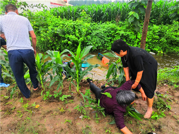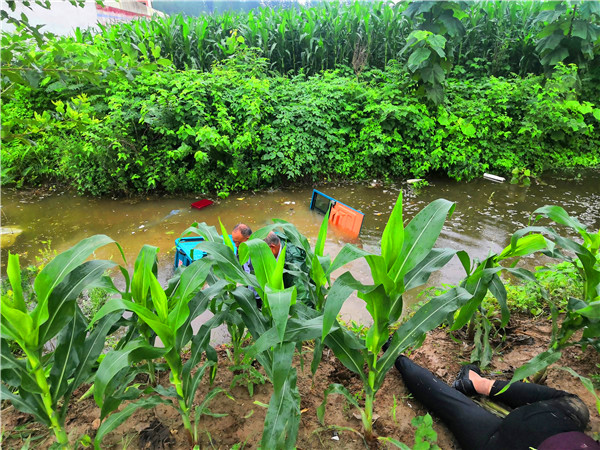 7月26日,連續(xù)多日的降雨已導(dǎo)致農(nóng)村坑滿河平、積水頗深。當(dāng)日下午4時(shí),依然時(shí)雷聲陣陣、雨如豆粒,二人在宜路鎮(zhèn)張寨村小學(xué)附近的玉米田間拍照核查“圖斑”時(shí),看到一輛車箱內(nèi)載有幾位老人的電動(dòng)三輪車冒雨從路邊疾駛過去。緊接著聽到“撲通”一聲,趙文波、李偉二人立即意識(shí)到是三輪車掉進(jìn)路溝、落水了。