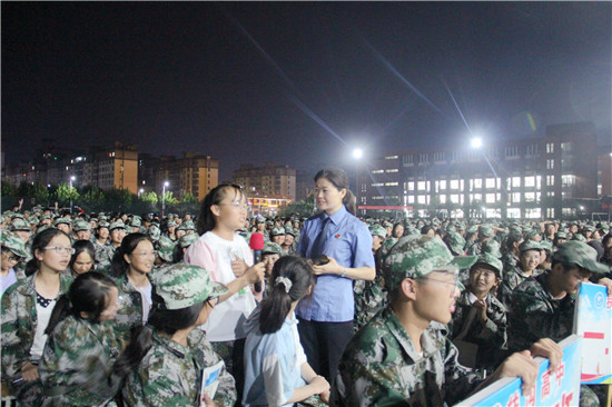 "你們正處于人生的花季,知識是養(yǎng)分,那么法律知識就好比是殺蟲劑,要學(xué)好,更要用好,要做到知法、守法、用法,在法治護(hù)航下遠(yuǎn)離校園欺凌,拒絕電信網(wǎng)絡(luò)詐騙,不義之財不可取,防范之心不可無……”。8月29日晚上7點(diǎn),黃昏謝去,暮色已經(jīng)模糊起來了,伴著淺淺的晚霞,扶溝縣檢察院檢委會專職委員郁玉琴帶領(lǐng)該院“女檢察官特別護(hù)未隊”的三名女檢察官到扶溝高中為正在接受軍訓(xùn)的1600余名高一新生們上了一堂別開生面的法治課。