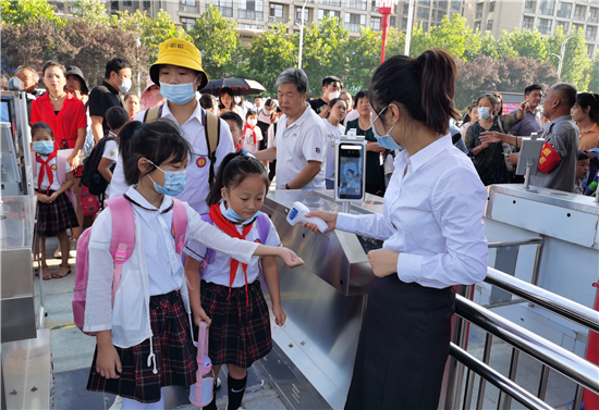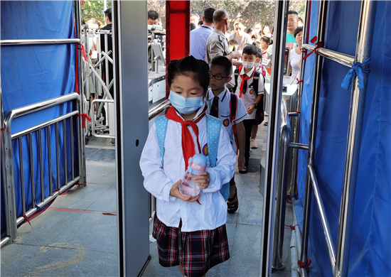 9月7日早上,周口市文昌小學(xué)的學(xué)生有序排隊(duì)測(cè)量體溫后進(jìn)入學(xué)校。據(jù)文昌小學(xué)校長介紹,全市中小學(xué)實(shí)行錯(cuò)峰開學(xué)。今天是小學(xué)開學(xué)時(shí)間,文昌小學(xué)學(xué)生每個(gè)年級(jí)實(shí)行錯(cuò)時(shí)上下學(xué),學(xué)生入校要測(cè)體溫,并為一年級(jí)新生舉辦了主題為“夢(mèng)從這里啟航”的“迎新儀式”。