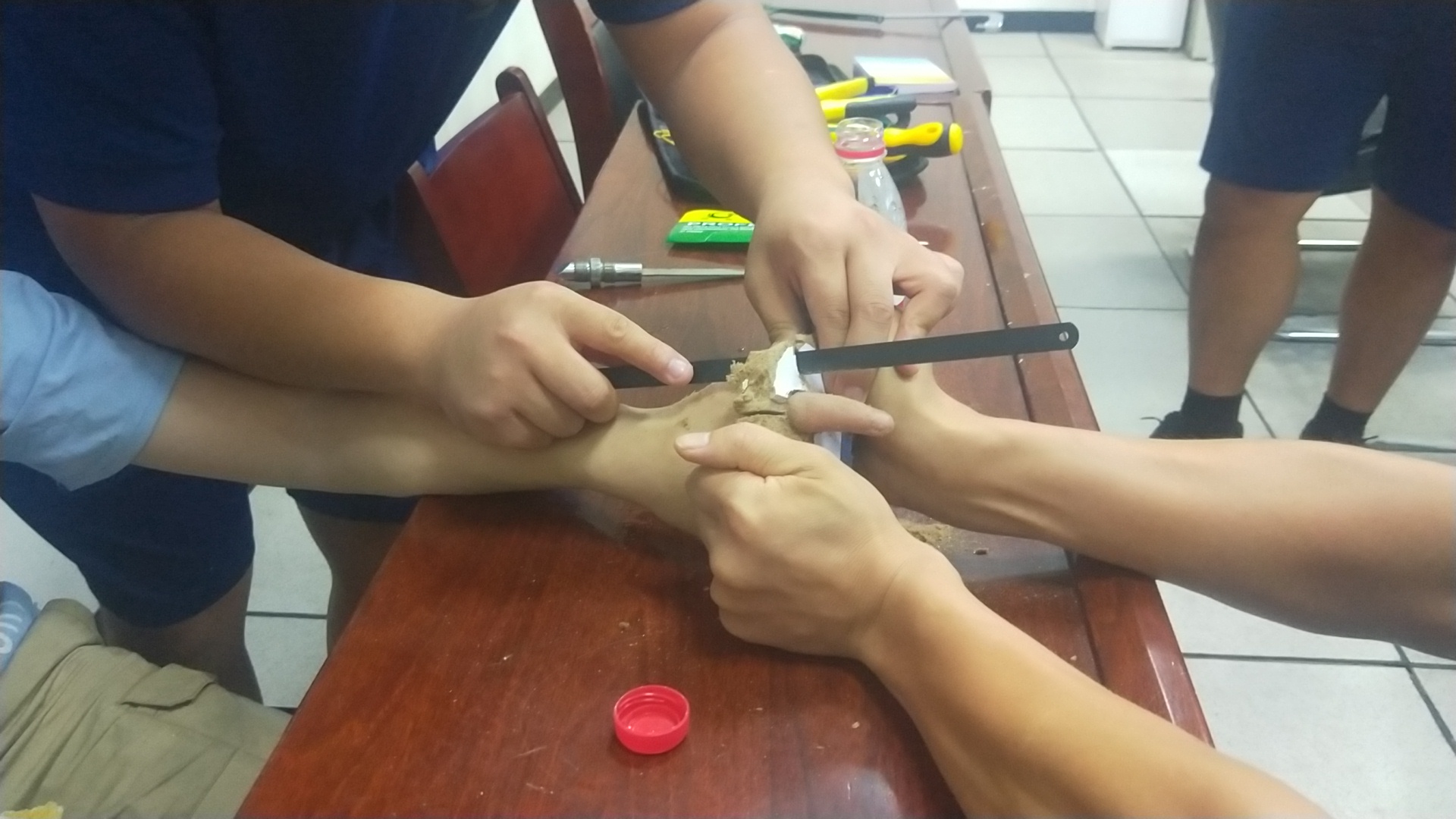 看到救援人員,小男孩十分害羞,有點不好意思。“我看桌子上有個孔,就是想看看手指能不能伸進去,結果就拔不出來了?!本仍藛T經觀察發(fā)現(xiàn),小男孩左手無名指被卡在課桌木板上的小孔里,木板已被裁下,木板材質為鋸末壓縮板,此時小男孩手指被卡部位周圍已發(fā)生腫脹必須馬上處理。救援人員利用鋼鋸將木板一點點鋸開,然后又用鉗子用力將木板夾開,經過3分鐘救援,成功將禁錮小男孩手指的木板摘除。看到木板被從手上取下,男孩長長地舒了口氣。