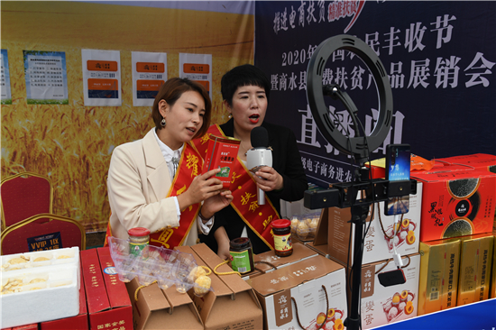 9月22日,兩名“網(wǎng)紅”在商水縣中國農(nóng)民豐收節(jié)暨商水縣消費扶貧產(chǎn)品展銷會上進行直播銷售。近年來,商水縣大力發(fā)展電商扶貧,出臺政策,幫助農(nóng)民通過網(wǎng)絡(luò)直播等手段把本地的豬蹄、咸鴨蛋、牛肉、變蛋、黑色五谷等特色農(nóng)產(chǎn)品銷往全國各地,打開農(nóng)產(chǎn)品銷售新渠道,為農(nóng)民脫貧致富奔小康增添新動能。