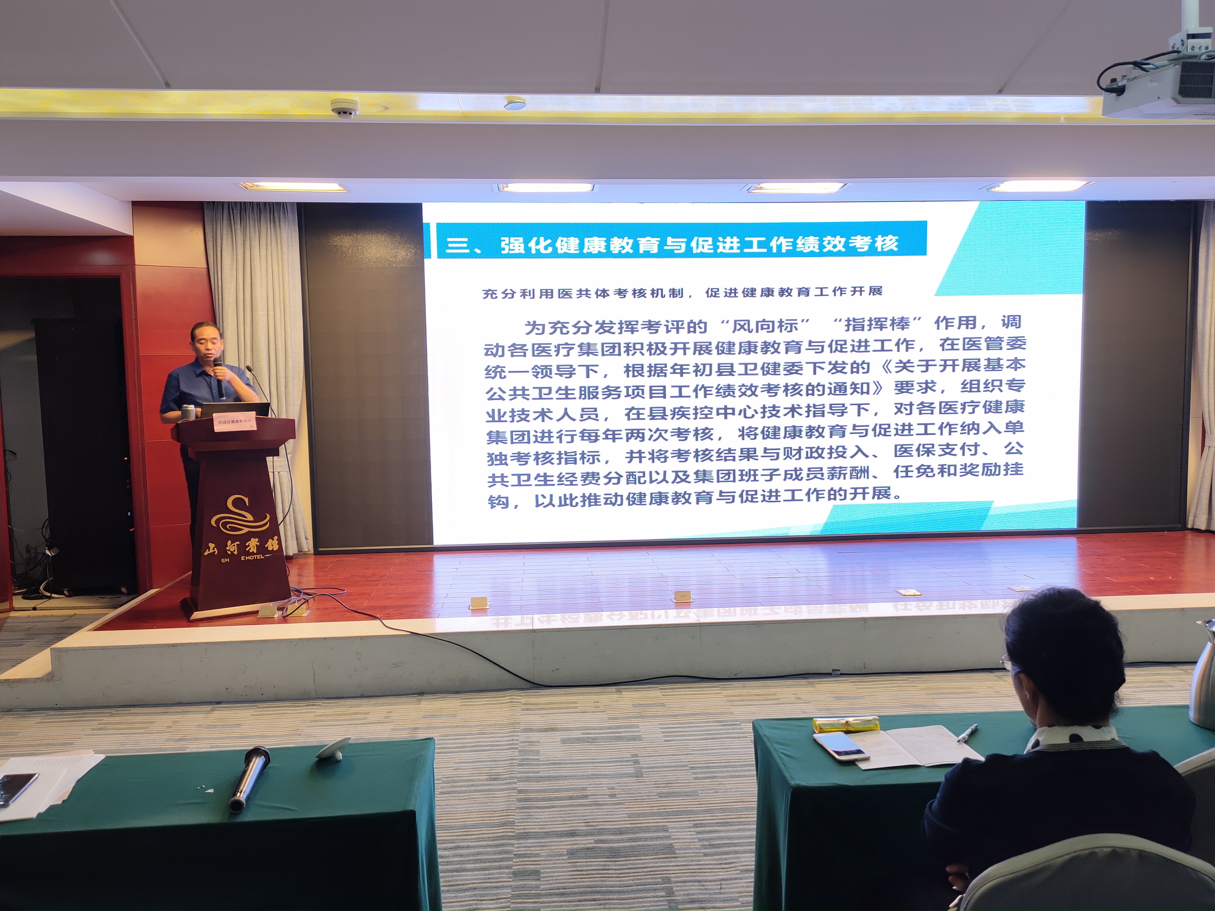 張吉志首先介紹了鄲城縣近年來健康教育工作的基本概況、取得的工作成績。然后,從領(lǐng)導(dǎo)重視、健全組織體系、強化工作措施、建強健康素養(yǎng)促進專業(yè)隊伍;部門聯(lián)動深入開展健康促進“321”工作模式、創(chuàng)新健康促進模式,提升健康素養(yǎng)水平;強化醫(yī)防融合,助力健康教育;突出重點,扎實推進省級健康促進縣創(chuàng)建工作;細化措施,規(guī)范開展居民健康素養(yǎng)監(jiān)測;加強工作督導(dǎo)等方面介紹了全縣醫(yī)共體背景下健康教育工作的開展情況?!班惓墙?jīng)驗”受到學員的高度評價。