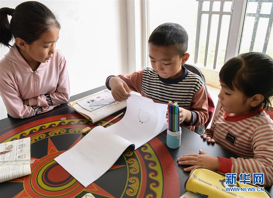 昭覺縣城城郊集中安置點南坪社區(qū)內,一戶彝族群眾家中的孩子圍坐在書桌旁畫畫(8月11日攝)。 新華社記者 李賀 攝