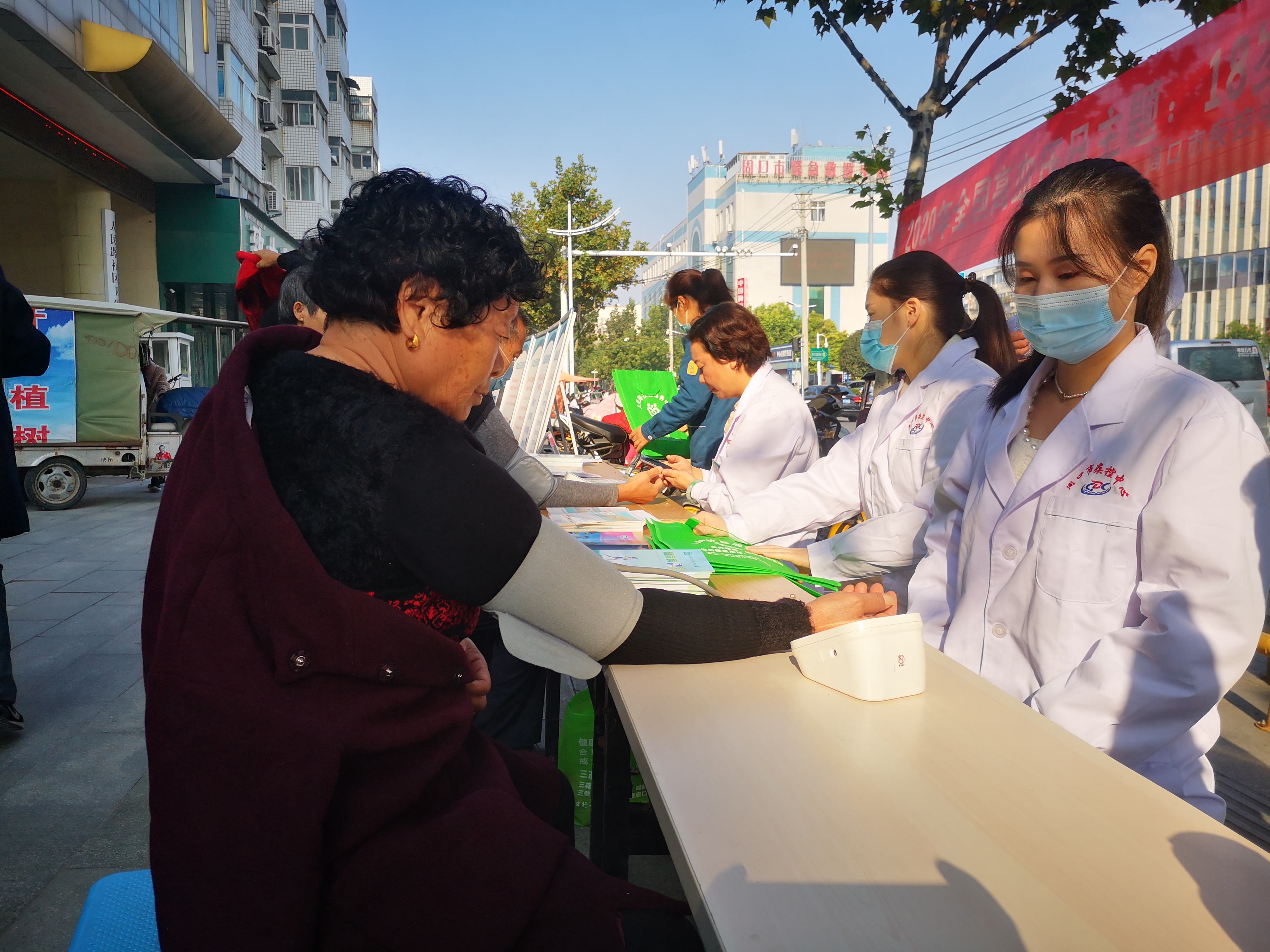 10月8日是第23個全國高血壓日,周口巿疾控中心積極開展防治高血壓科普知識宣傳活動,在人民路東段設(shè)立咨詢義診臺,為前來咨詢的群眾測量血壓、血糖,向群眾宣傳“合理膳食,適量運(yùn)動”“健康心率、健康血壓”等知識。圖為市疾控中心工作人員為過往群眾測量血壓。