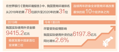 “十三五”期間,我國持續(xù)深化體制機制改革,全方位擴(kuò)大對外開放,降低準(zhǔn)入門檻,提升服務(wù)質(zhì)量。在世界銀行《營商環(huán)境報告》中,我國營商環(huán)境排名從2018年的第78位躍升至2020年的第31位,連續(xù)兩年躋身全球營商環(huán)境改善最快的前10個經(jīng)濟(jì)體之列。