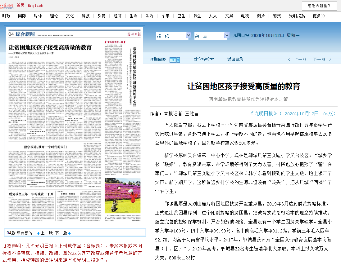 今天(2020年10月12日)出版的《光明日報(bào)》綜合新聞版,以頭條顯著位置刊登《讓貧困地區(qū)孩子接受高質(zhì)量的教育——河南鄲城把教育扶貧作為治根治本之策》,對鄲城教育成果進(jìn)行了詳細(xì)而深入的報(bào)道,這里全文轉(zhuǎn)載,以饗讀者——