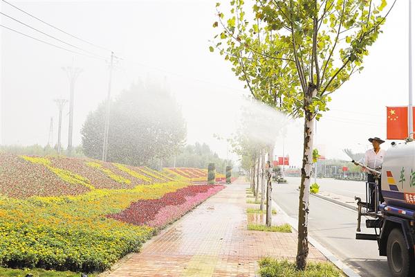 自9月下旬以來,周口港區(qū)在主要道路布置大量鮮花,為城市增色添彩。圖為園林工人正在澆水。