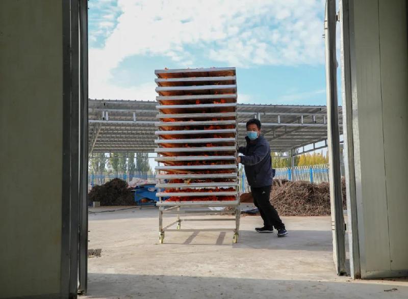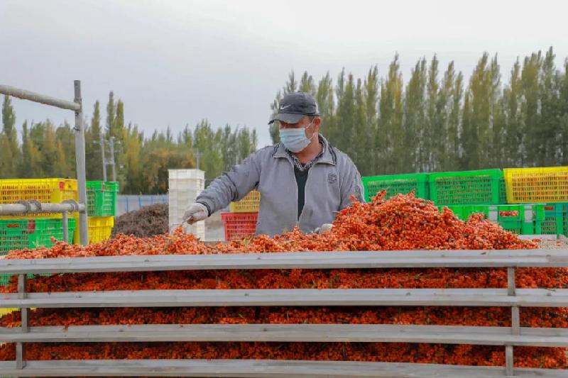 10月12日,記者在托里鎮(zhèn)永集湖村的烘干廠房看到,工人們正忙著處理收購(gòu)來的沙棘,并推入烘干箱進(jìn)行烘干作業(yè)。