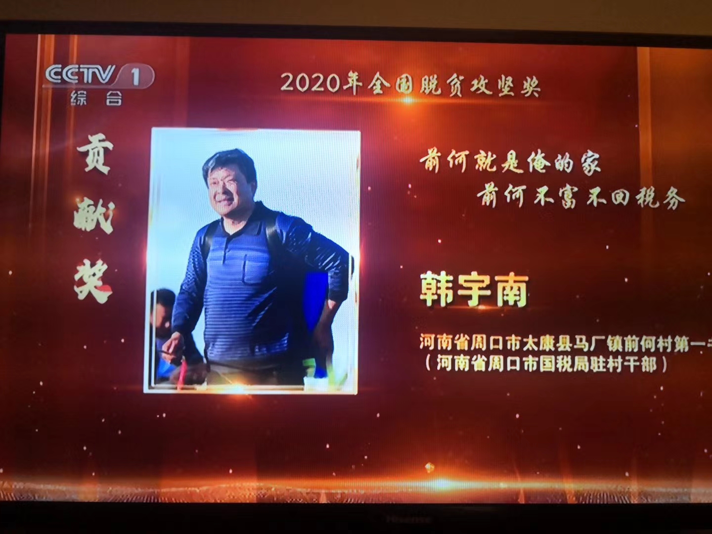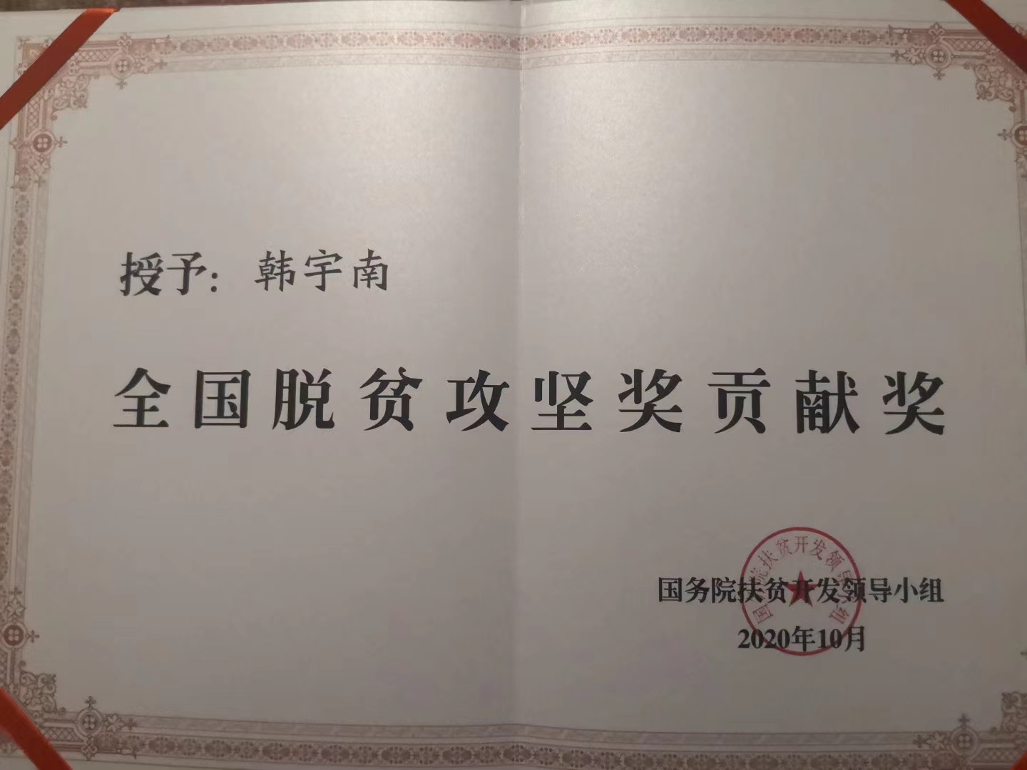 10月17日,2020年全國脫貧攻堅獎表彰大會暨首場脫貧攻堅先進事跡報告會在北京舉行。當天,國務院扶貧開發(fā)領導小組辦公室官網發(fā)布了關于表彰2020年全國脫貧攻堅獎的決定,太康縣馬廠鎮(zhèn)前何村第一書記韓宇南榮獲全國脫貧攻堅貢獻獎。