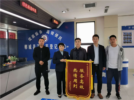 10月20日,鄲城縣王子世界城房地產(chǎn)開發(fā)企業(yè)代表將一面繡有“服務(wù)高效、熱情周到”的錦旗,送到鄲城不動產(chǎn)登記中心窗口,對鄲城縣不動產(chǎn)登記中心干部職工,主動作為、心系企業(yè)、熱情服務(wù)的工作態(tài)度表示感謝。
