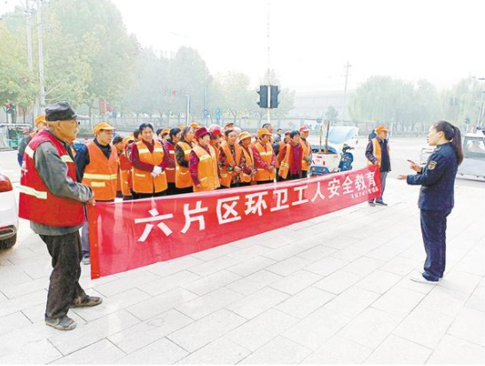 為保障環(huán)衛(wèi)工人的安全,項城市城管局每周二定期對環(huán)衛(wèi)工人開展安全教育,提醒環(huán)衛(wèi)工人霧天不上主干道、掃地順車道、過馬路注意信號燈等,增強了環(huán)衛(wèi)工人的安全交通意識。圖為項城市城管局六片區(qū)負(fù)責(zé)人為環(huán)衛(wèi)工人講解安全知識。