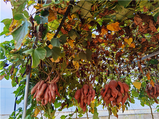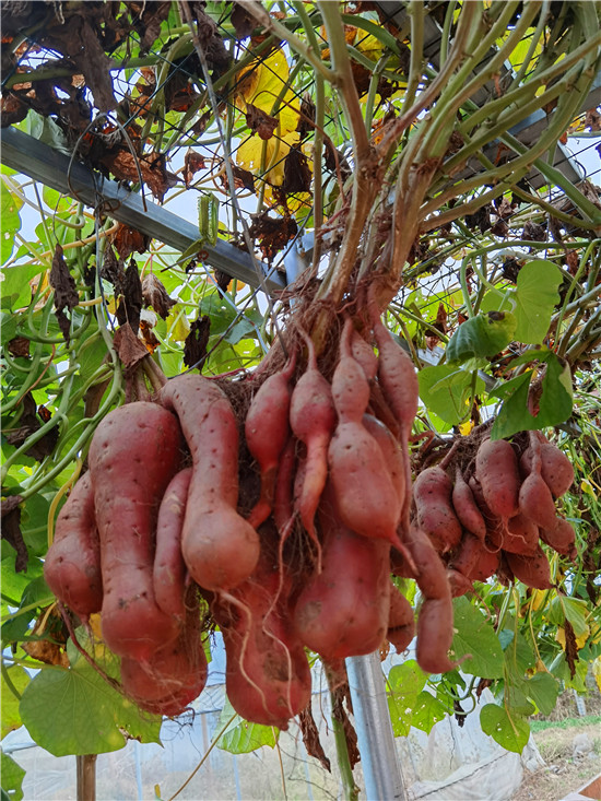 西華縣農(nóng)科所積極開展“空中結(jié)薯”試驗(yàn)種植研究,并取得成功。“空中結(jié)薯”采取嫁接技術(shù),選用旋花科植物牽牛作砧木,脫毒薯苗作接穗嫁接而成,嫁接成活后栽到土壤里,搭建棚子,加強(qiáng)薯苗水肥管理,每株插一根小竹木桿,促進(jìn)薯苗快速生長上棚,在棚上吊花盆,盆內(nèi)放蛭石,生長到掤上的薯秧壓到花盆里,加強(qiáng)水肥管理。90天結(jié)薯,進(jìn)入10月份把花盆去掉。該技術(shù)打破傳統(tǒng)栽培方式,主要為公園、科技園區(qū)、農(nóng)業(yè)生態(tài)觀光園、家庭庭院內(nèi)培植,有很好的科研價(jià)值、觀賞價(jià)值和農(nóng)業(yè)推廣價(jià)值。周口日報(bào)·周道客戶端記者李鳳霞 攝