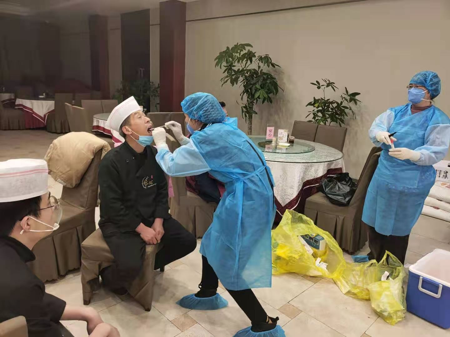 為助力第一屆周商大會(huì)圓滿(mǎn)成功,市衛(wèi)生健康委抽調(diào)近百名調(diào)精兵強(qiáng)將組成衛(wèi)生保障專(zhuān)班開(kāi)展衛(wèi)勤保障工作。圖為工作人員在市委黨校迎賓館和體育賓館餐廳對(duì)后廚人員做核酸檢測(cè)及開(kāi)展冷鏈?zhǔn)称废尽?/p>