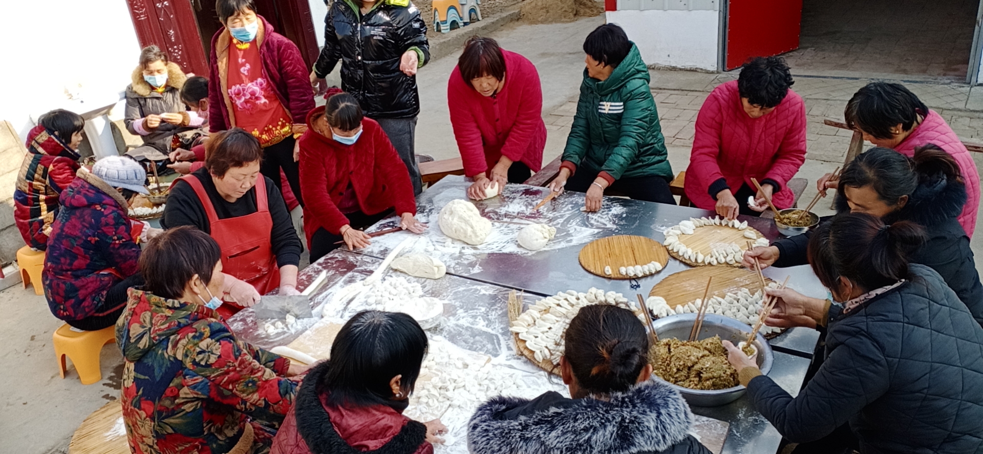 鄉(xiāng)村大食堂院子里,大家有說有笑,圍在數(shù)平方米的巨大案板前,個個拿出了看家本領(lǐng),分工協(xié)作,揉面、搟皮、包餃子,個個動作嫻熟,包起餃子來麻利干練,不知不覺間,面前的盤子里就擺滿了餃子。