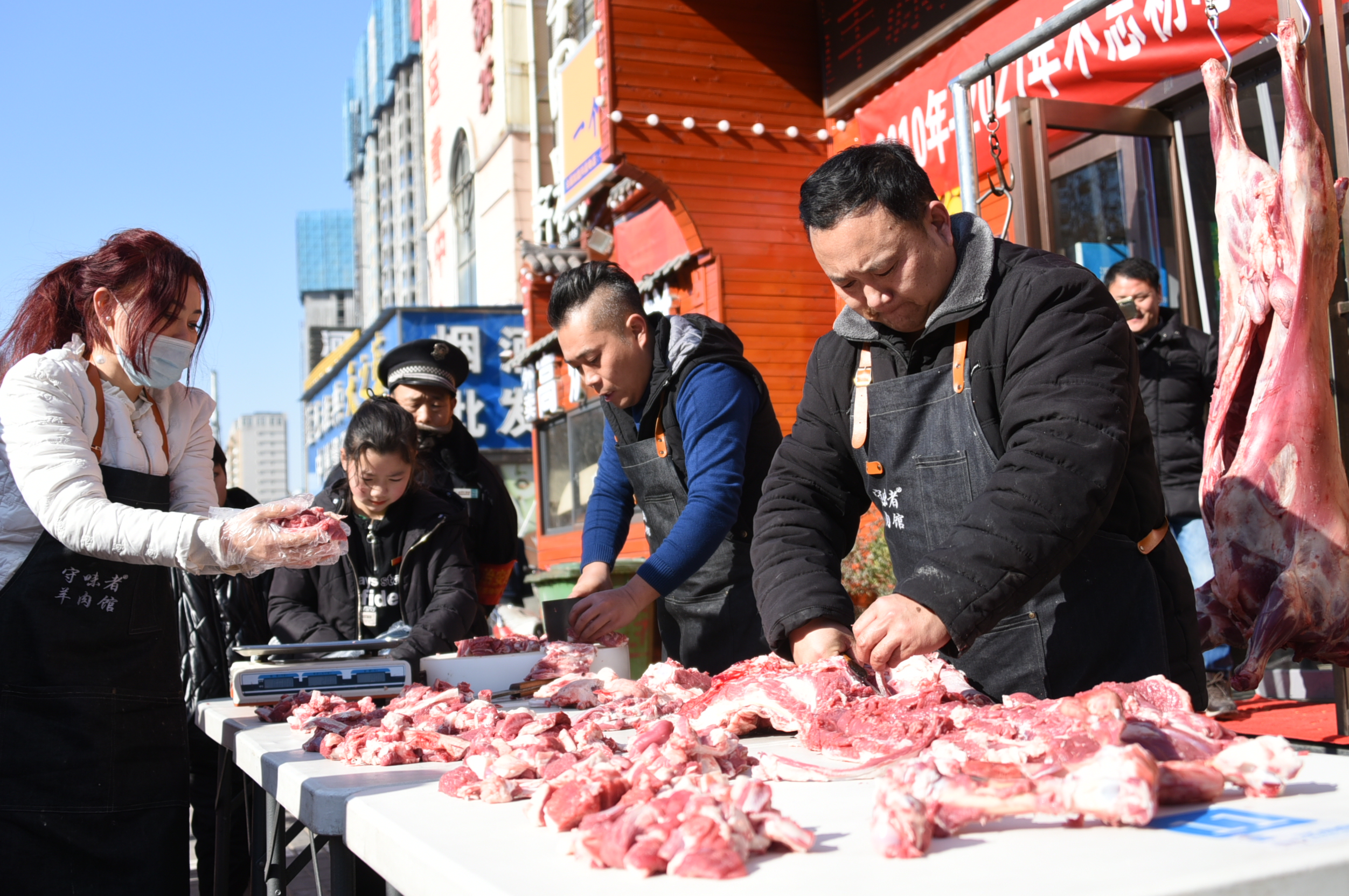 已經(jīng)連續(xù)11年為環(huán)衛(wèi)工人、殘疾人朋友、困難家庭派發(fā)愛心羊肉被大家稱之為“羊肉哥”的太康籍孫合理以及該店店老板的陳峰正在忙碌著將羊肉分割成小塊,孫合理的愛人劉曉愛、小女兒孫夢(mèng)露也在一旁幫忙。