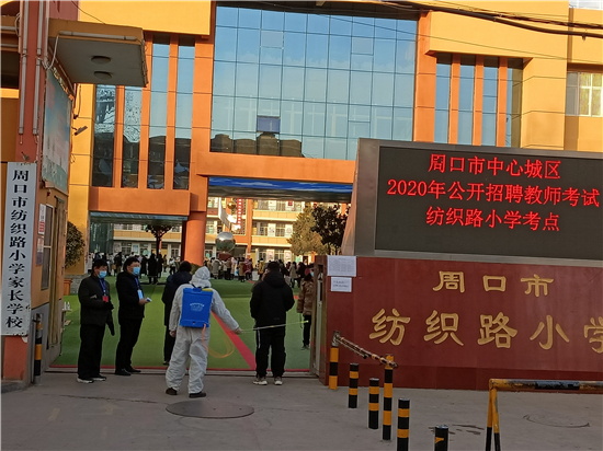 1月10日,周口市中心城區(qū)2020年公開(kāi)招聘教師考試,考試時(shí)間是一天。當(dāng)天下午,記者在周口市中心城區(qū)2020年公開(kāi)招聘教師考試紡織路小學(xué)考點(diǎn)看到,工作人員在做好考務(wù)工作的同時(shí)還做好疫情防控工作。圖為工作人員做好防疫消殺。