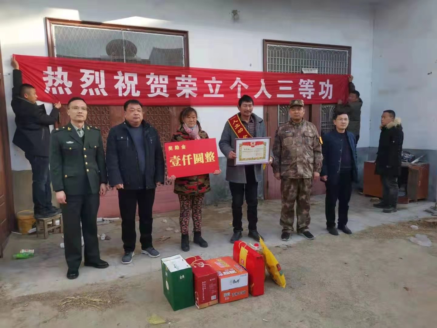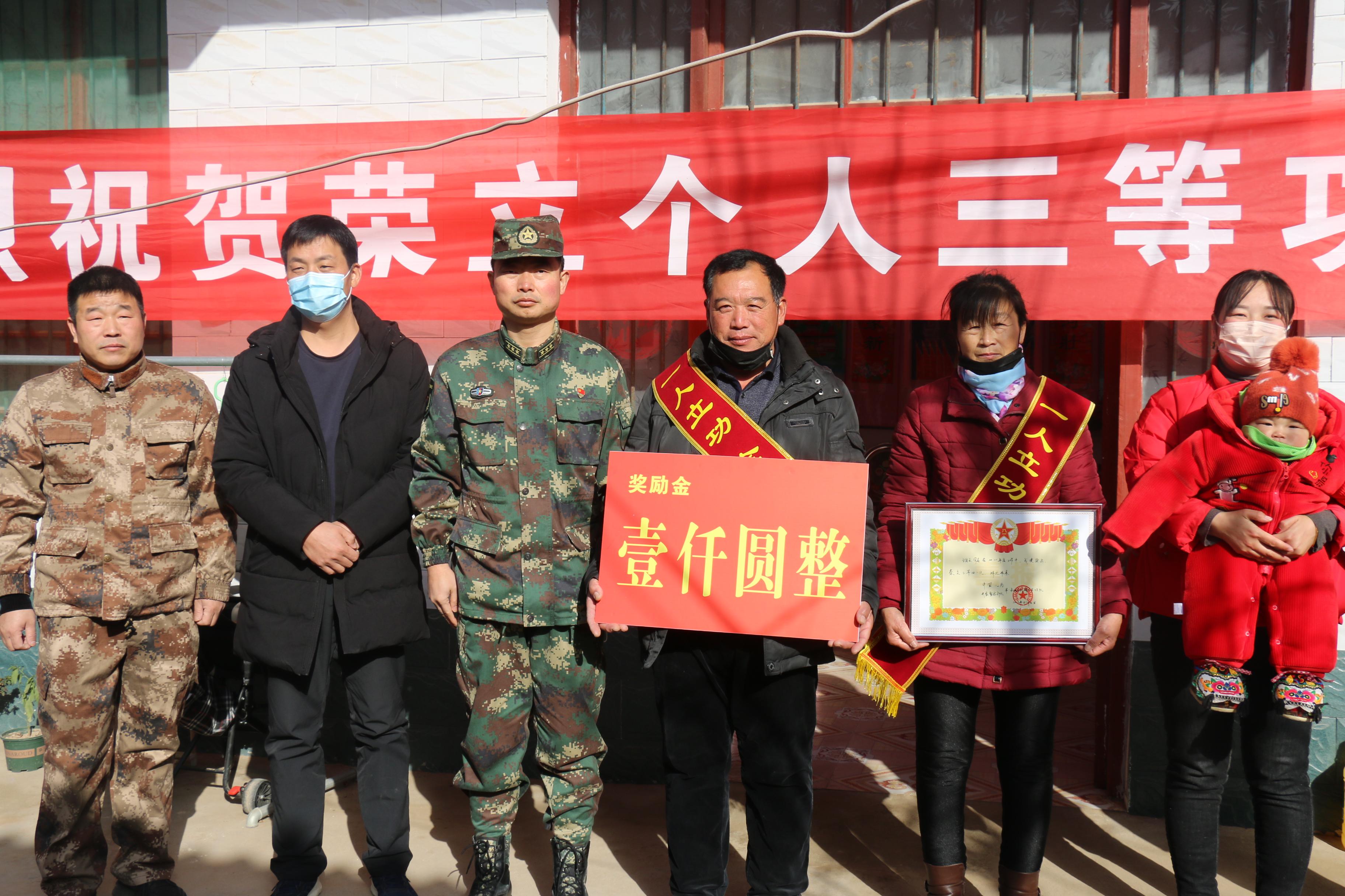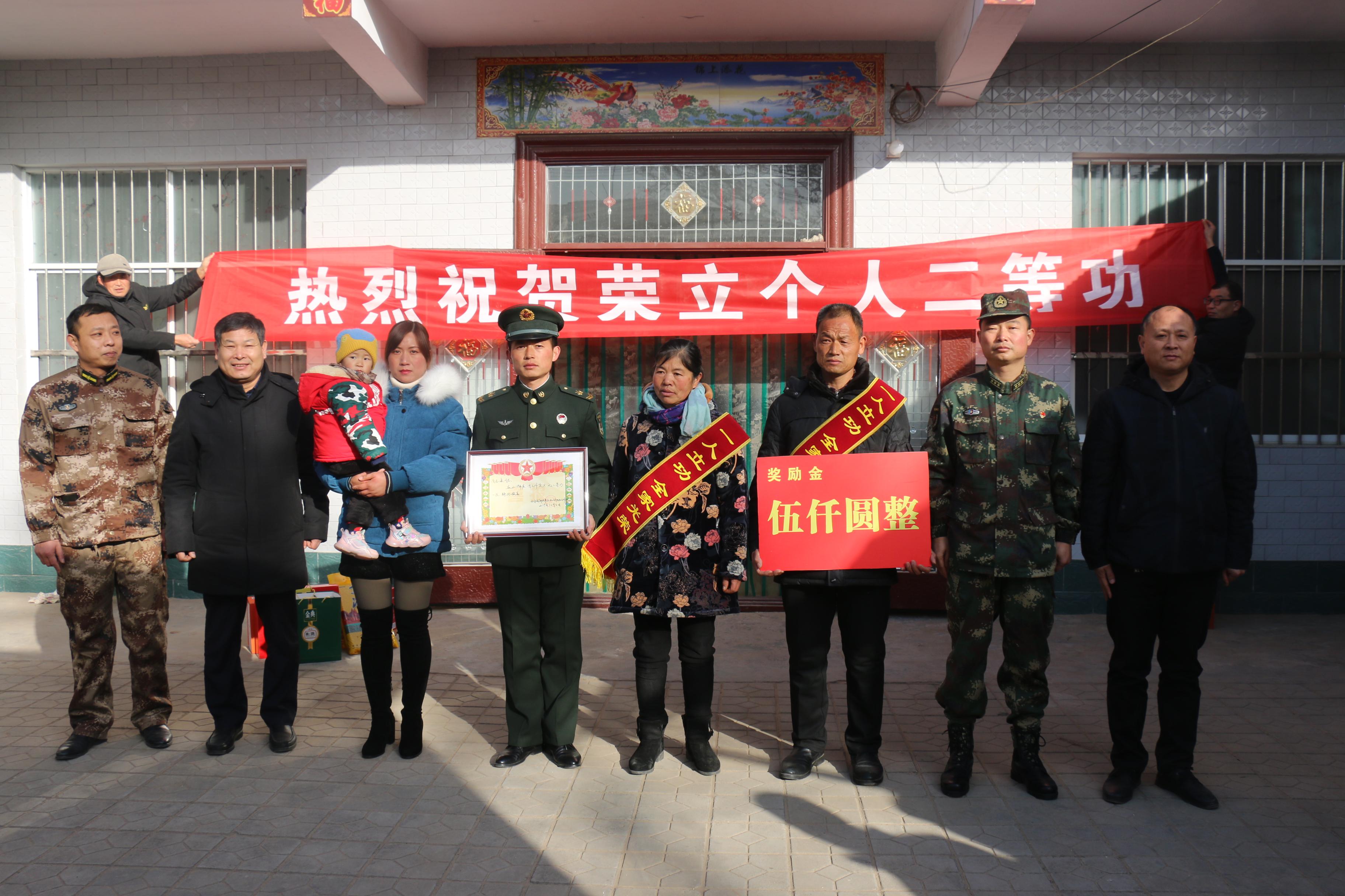 1月12日上午,西華縣西華營鎮(zhèn)雙樓村某部士官高志豪家中鑼鼓喧天,喜氣洋洋。該縣人武部政委涂友佳、縣退役軍人事務(wù)局局長龔坤敬一起把二等功喜報和“一人立功,全家光榮”的紅色綬帶及5000元現(xiàn)金等送到高志豪及其父母手中。